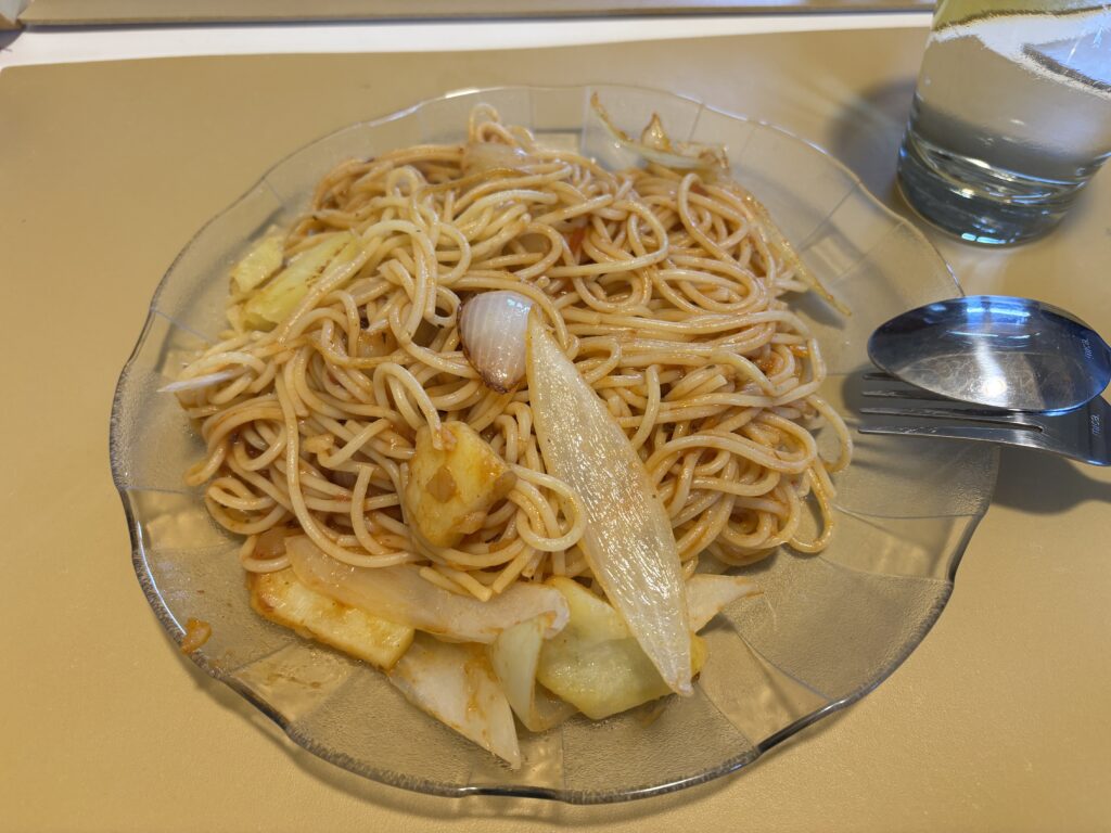 今日の夕食は、じゃがいもと玉ねぎ入りのパスタ。