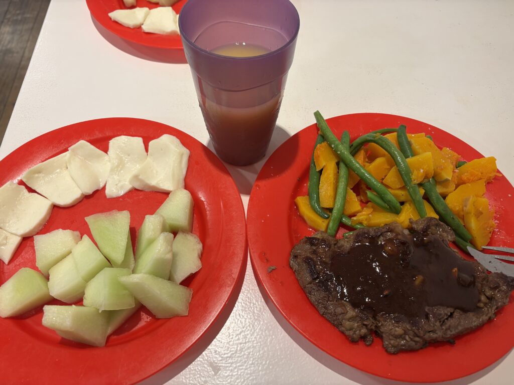 今日の夕食は、ステーキ、さやいんげんと西洋かぼちゃのバターソテー、モッツァレラチーズ、そしてメロン。