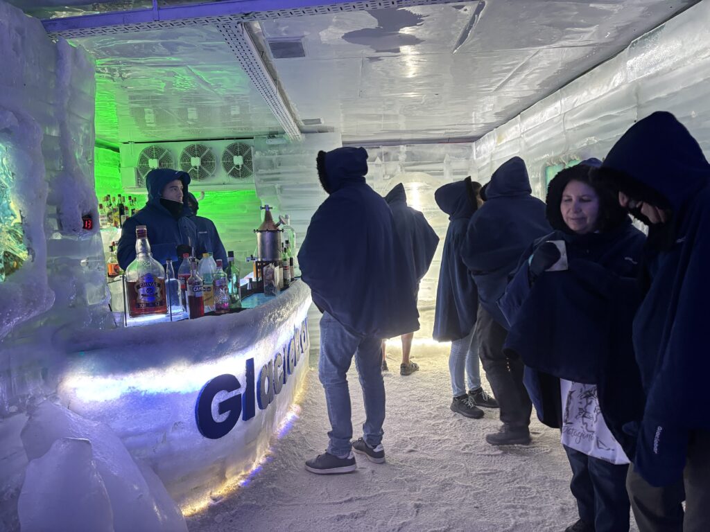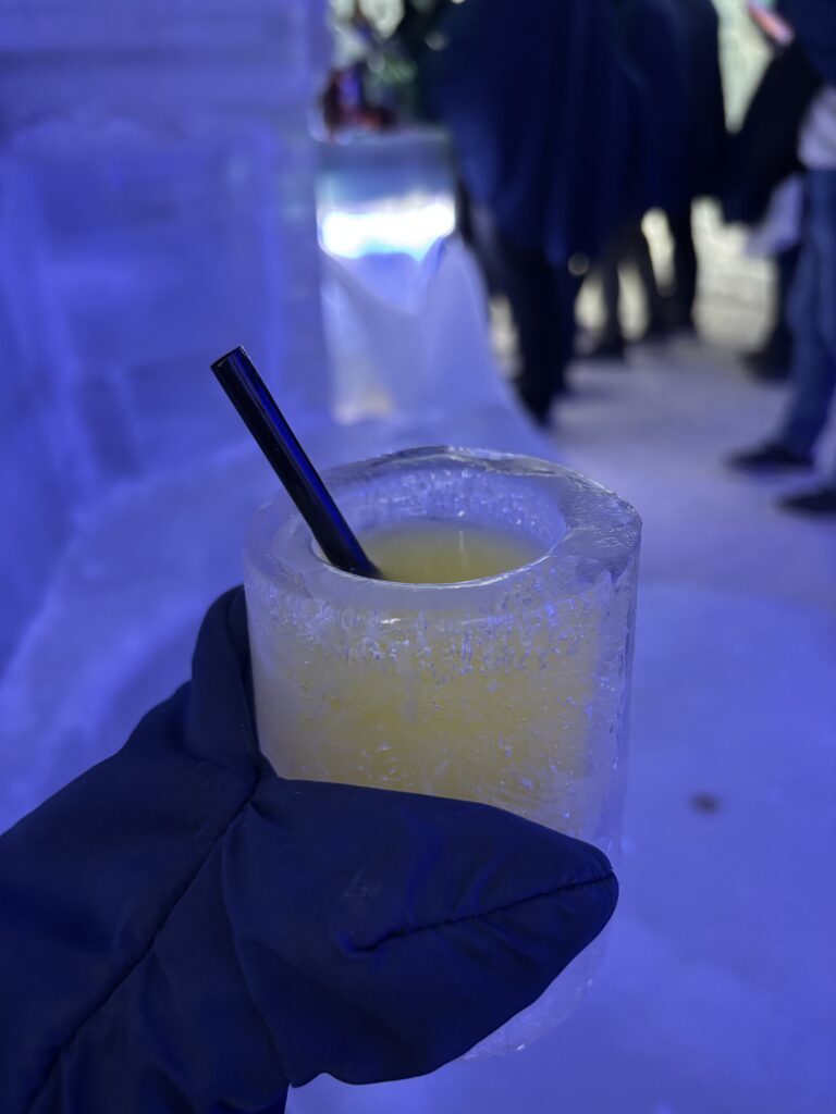 中に入ると、氷の壁とカウンターに囲まれた空間で、防寒着を着たままドリンクを楽しむという、なかなか不思議な体験。