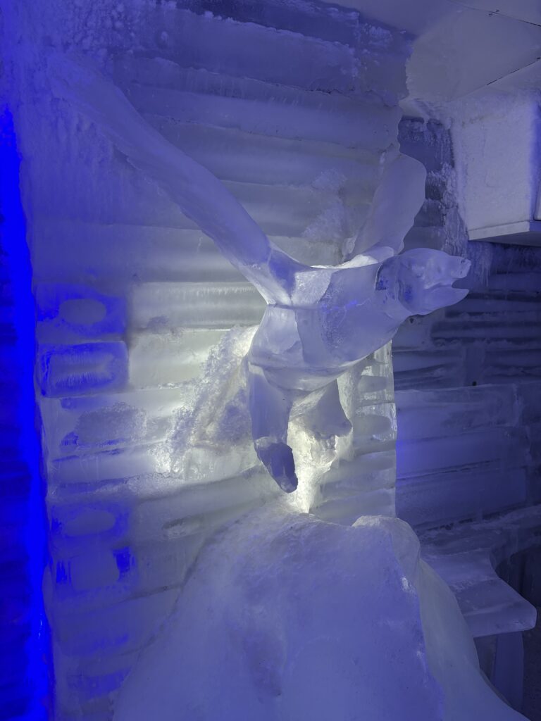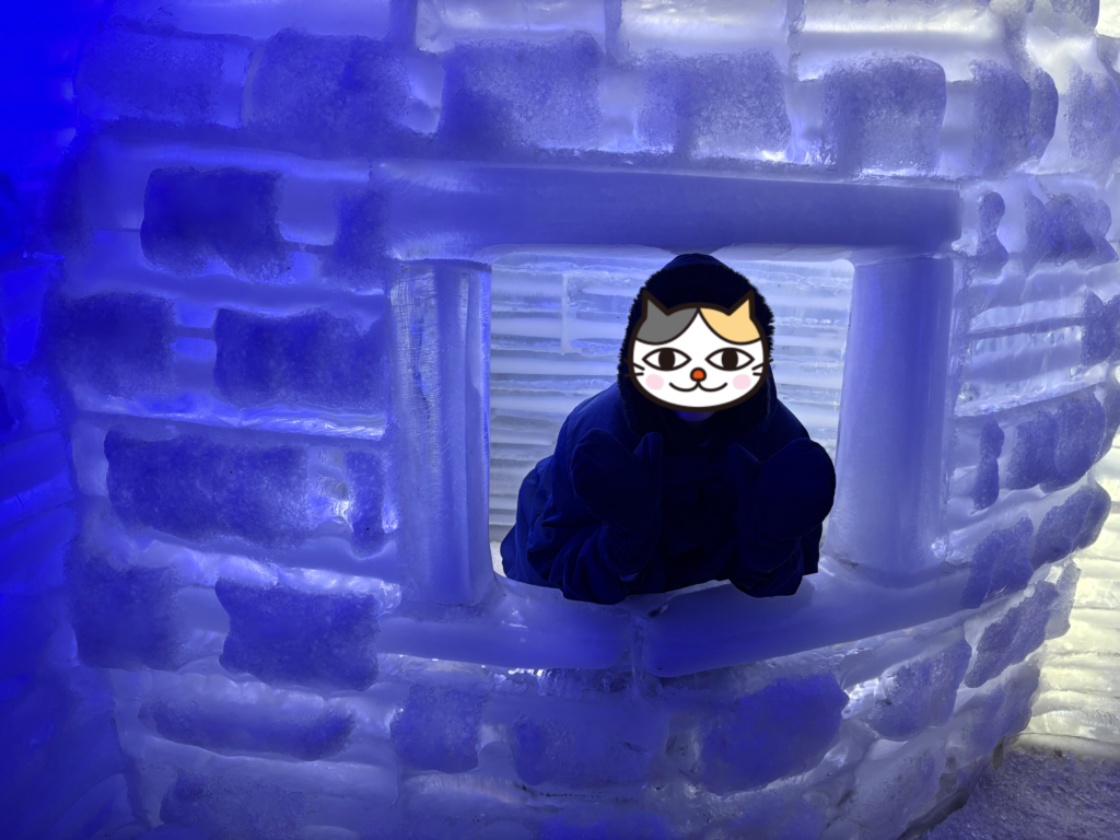かまくらのような氷の小部屋や、翼を広げた鳥の氷のオブジェもあった。