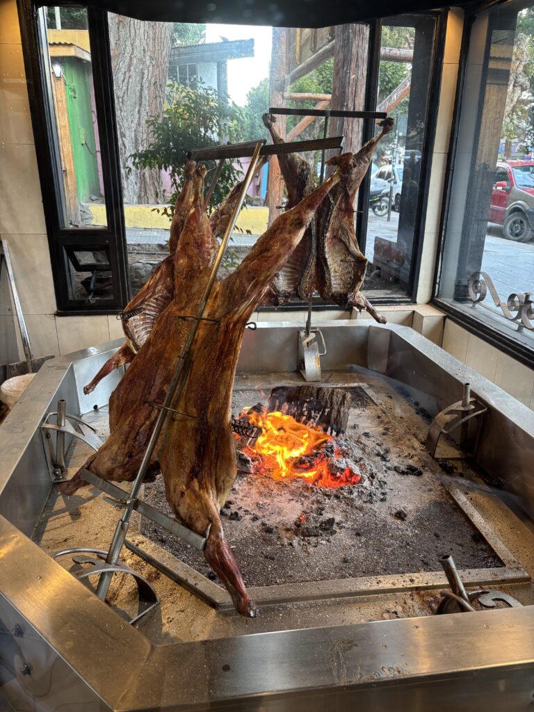 入口には、丸ごと子羊を串に刺し、薪火でじっくり焼く「アサード・アル・アサドール(Asado al Asador)」が置かれている。