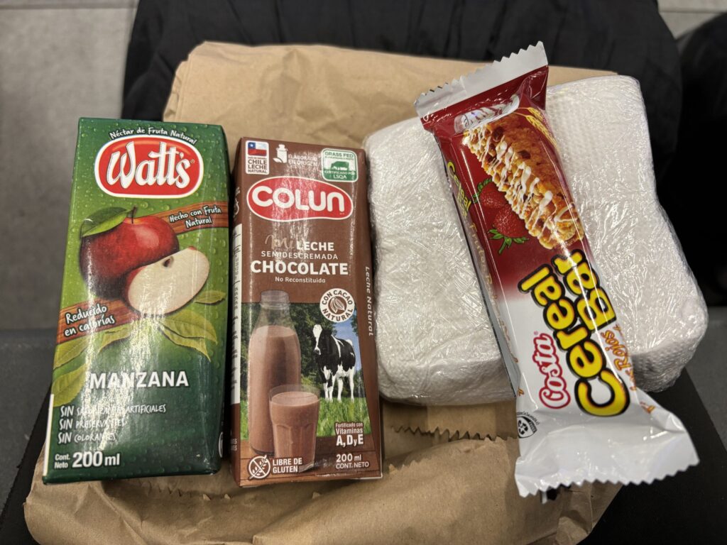 中身は、チョコラテ、リンゴジュース、シリアルバー、サンドイッチ。