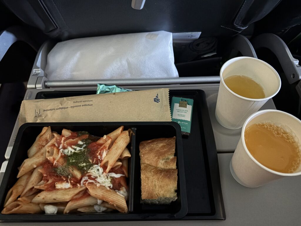 到着間際に2度目の機内食が配られ、今回はパスタを選択。