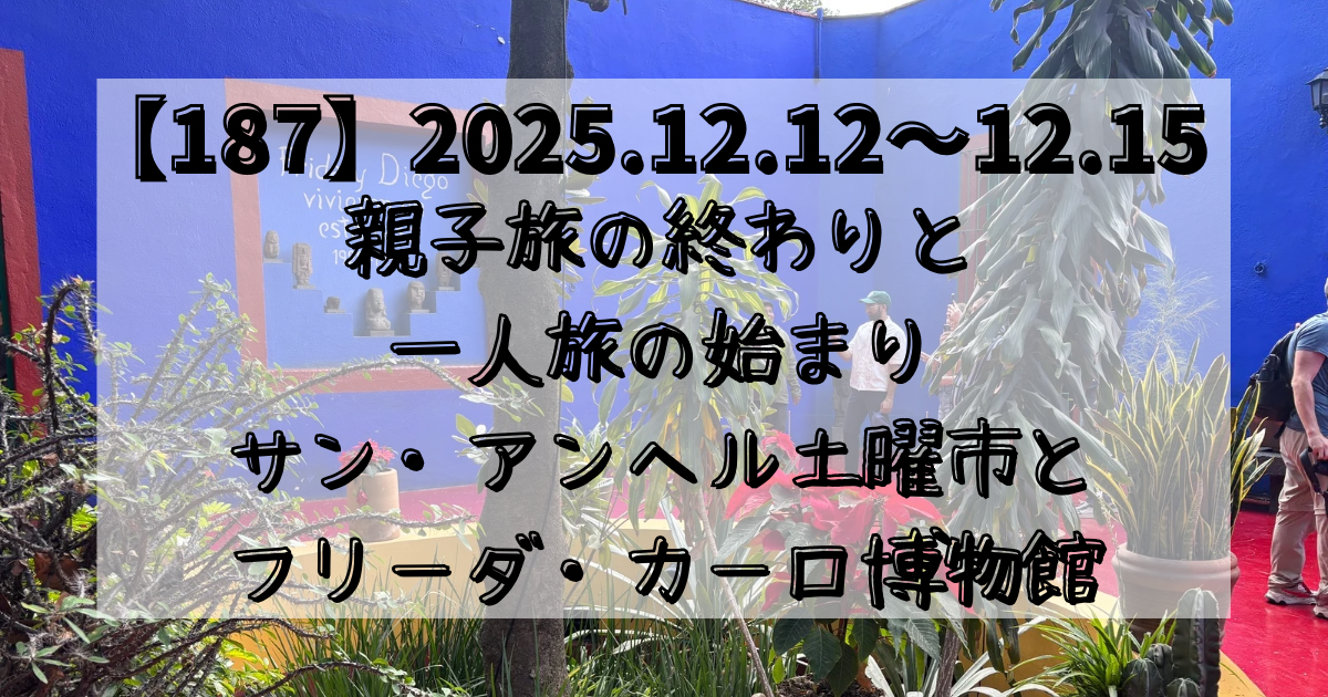 移動の疲れと安心が入り混じる中、日本食に救われ、サン・アンヘル土曜市では父と並んでセルビン焼きを選び、旅の締めくくりらしい時間を過ごした。