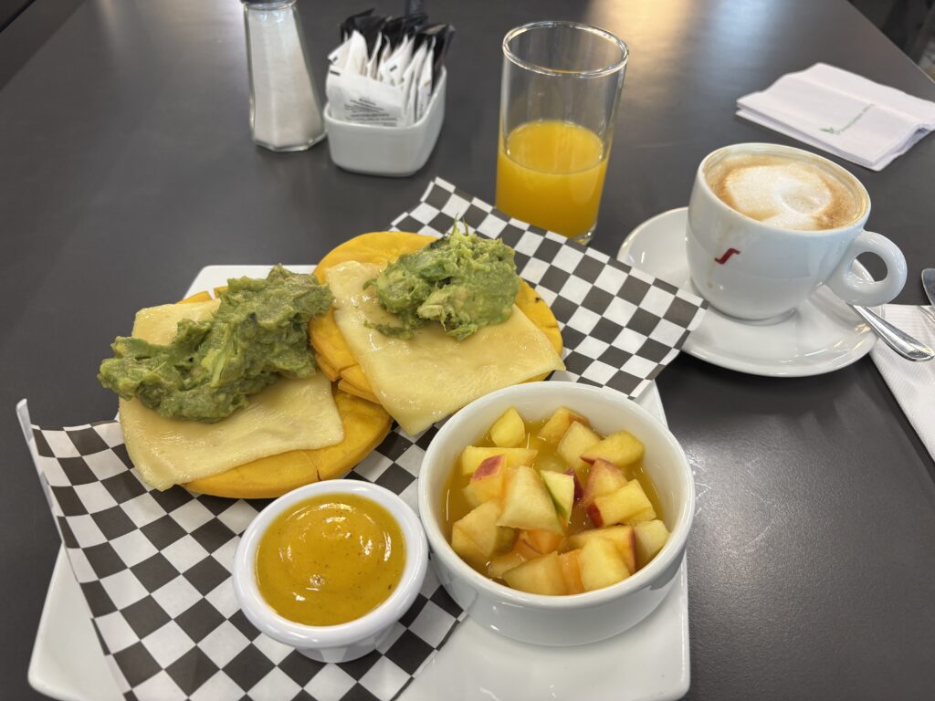 注文したのは、アボカドとチーズがのったソパイピージャ(揚げパン)に、フルーツサラダが付いた朝食セット。