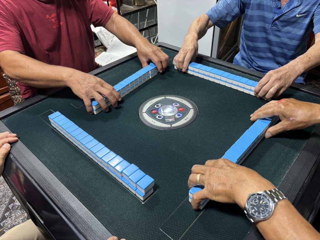 夕方、ダイニングを覗くと、おじさんたちが麻雀中。