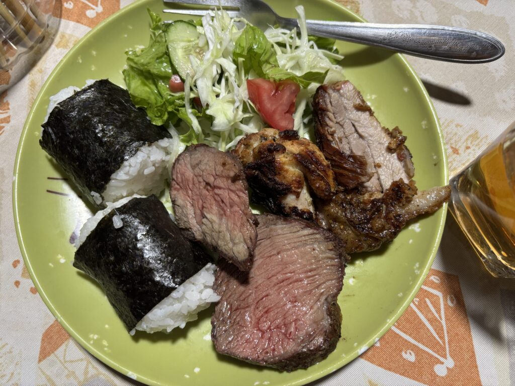 牛肉、鶏肉のアサードとおにぎり&サラダの夕食