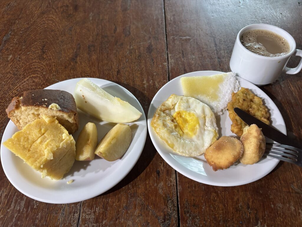 目玉焼き、パンケーキ、フルーツ、そしてコーヒー。
