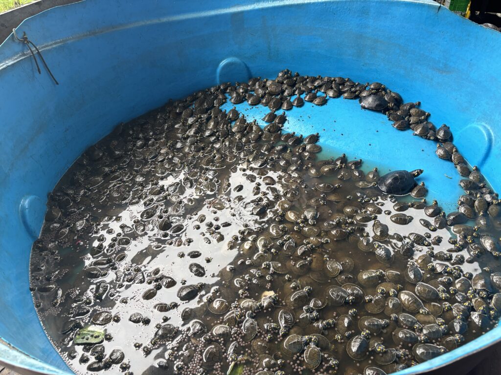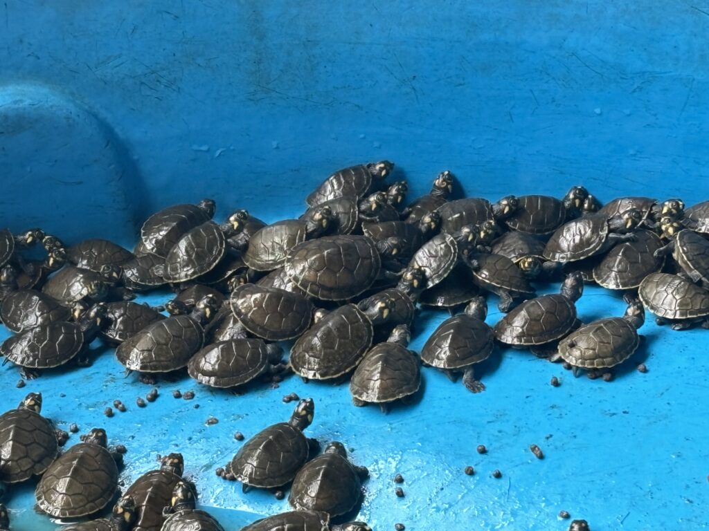 卵からかえったばかりの子ガメは、自然界では天敵に襲われやすく、生存率がとても低い。