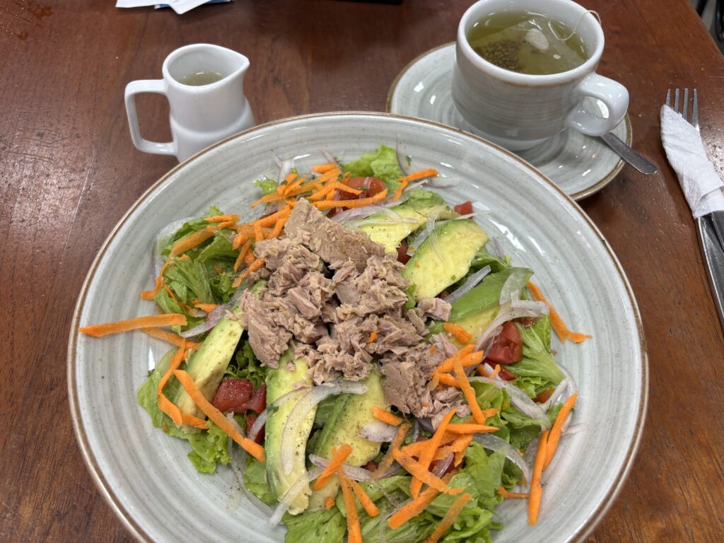 ツナサラダとハーブティーで29ソル(=1,325円)。