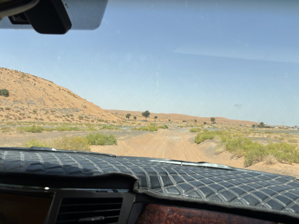 迎えの車に乗り込むと、ぽつぽつと緑が生える砂漠をぐんぐん走る。
