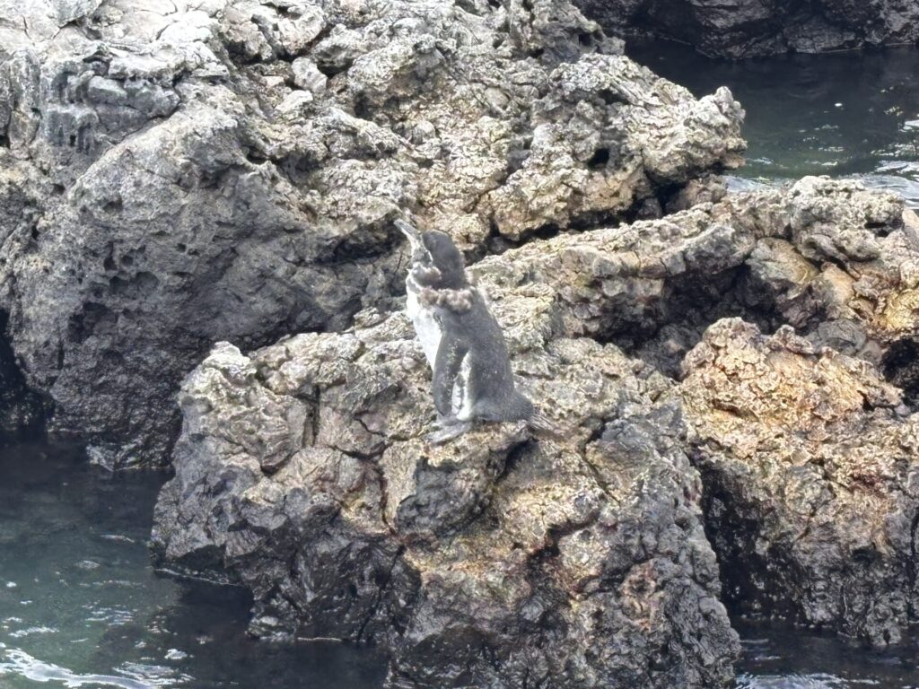 島に近づくと、溶岩の岩場の上にガラパゴスペンギンの姿。