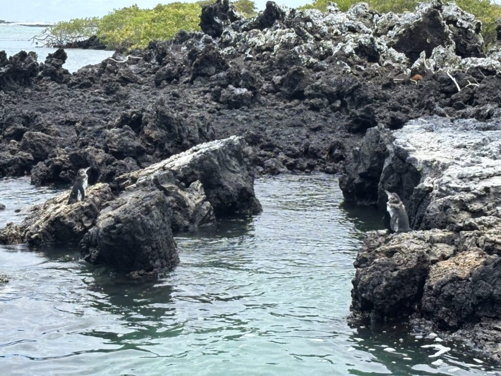 島を離れるとき、岩場に2羽のガラパゴスペンギン。