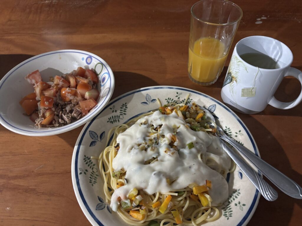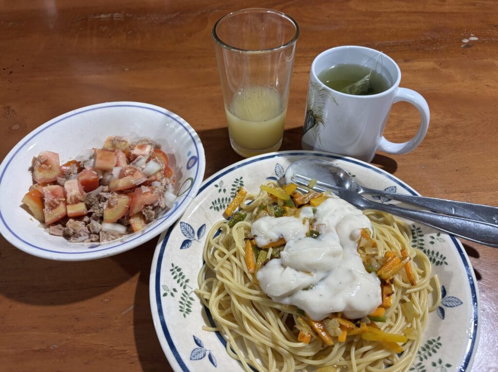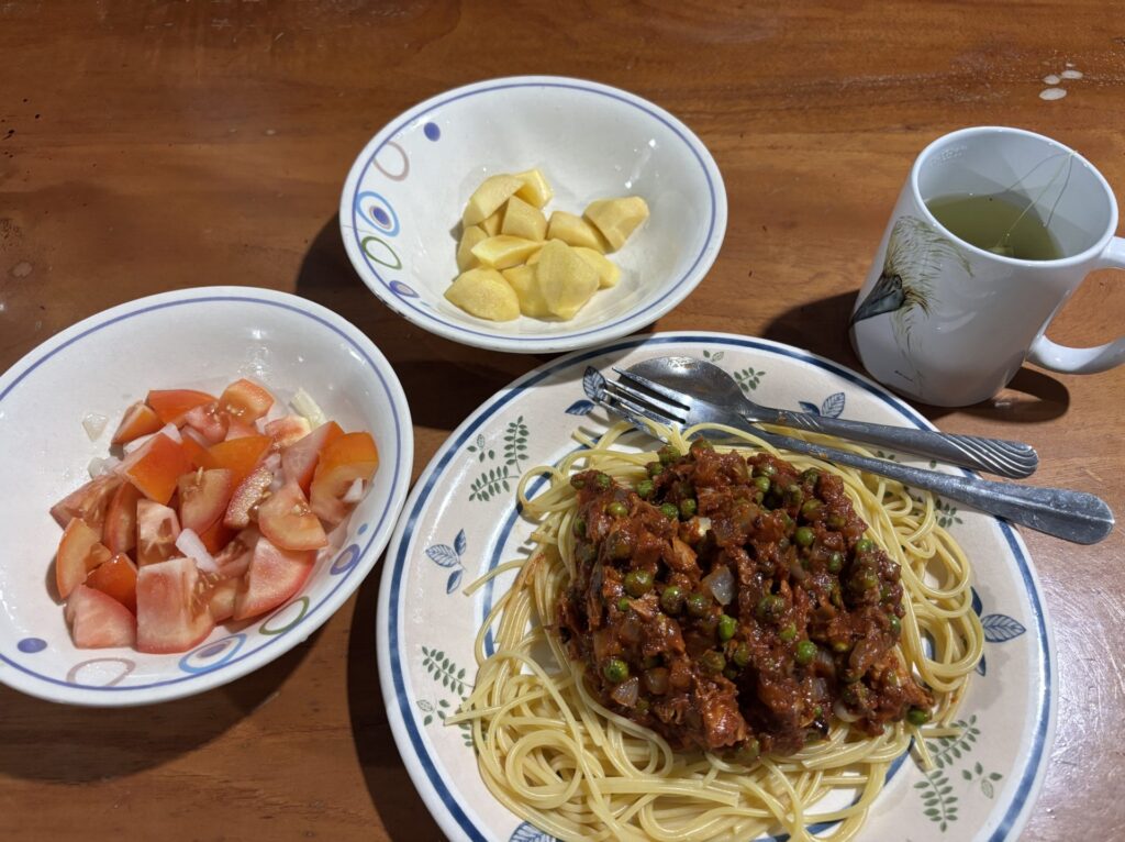 トマトソースにグリーンピースと玉ねぎ、ツナを加えて、ツナパスタに。
