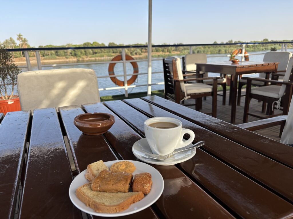 デッキに立つと、ゆったりと流れるナイル川と、その向こうに広がる乾いた砂漠が一望できる。