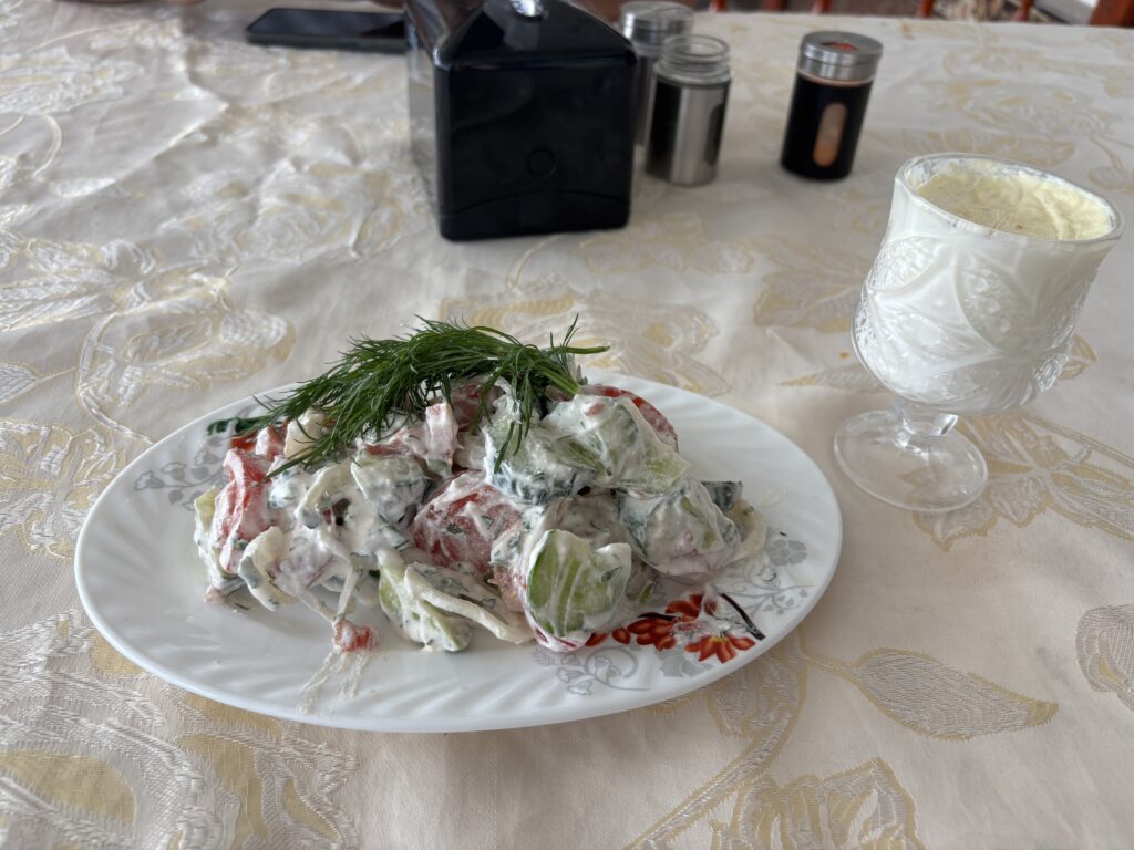 ベッドのような座敷席でくつろぎながら、サラダと自家製ヨーグルト、サモサを注文。