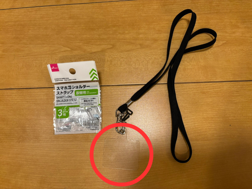 盗難防止のため、ストラップでショルダーバッグに括り付けています。